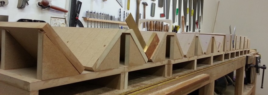Glue-up of narrow milled stock ready for the small dovecote roof.